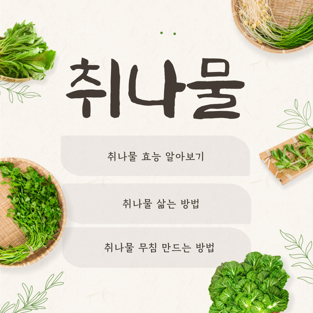 나물 요리는 취나물을 삶거나 볶아 간장, 고춧가루, 다진 마늘 등으로 간을 주어 맛을 낼 수 있습니다.