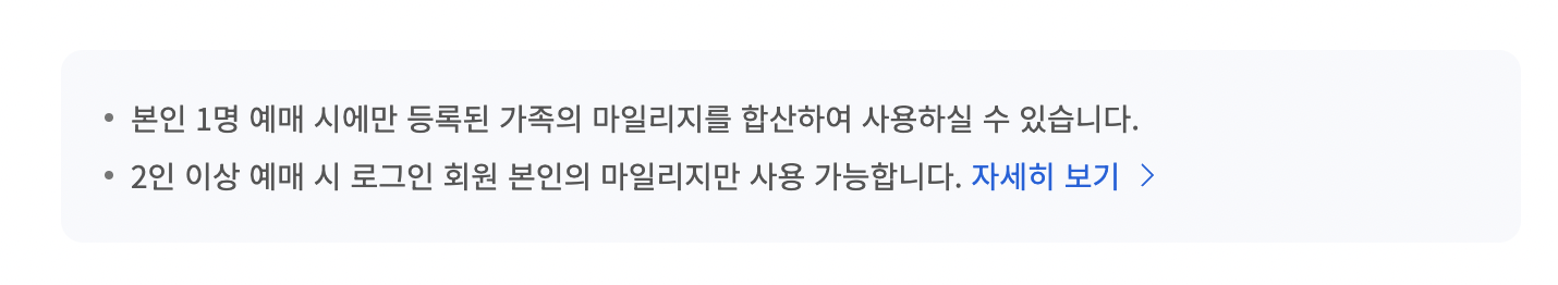 하지만 2인 이상 할때는 로그인 회원 본인 마일리지만 사용이 가능하다고 합니다.