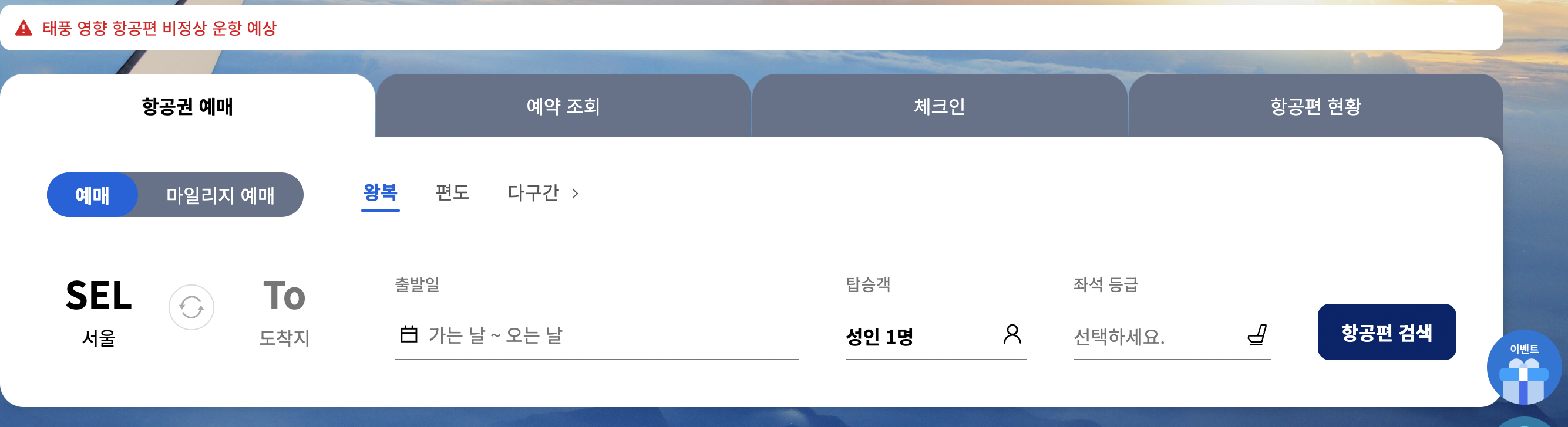 대한항공 사이트에 들어가면 예매 할 수 있는 화면이 나옵니다.