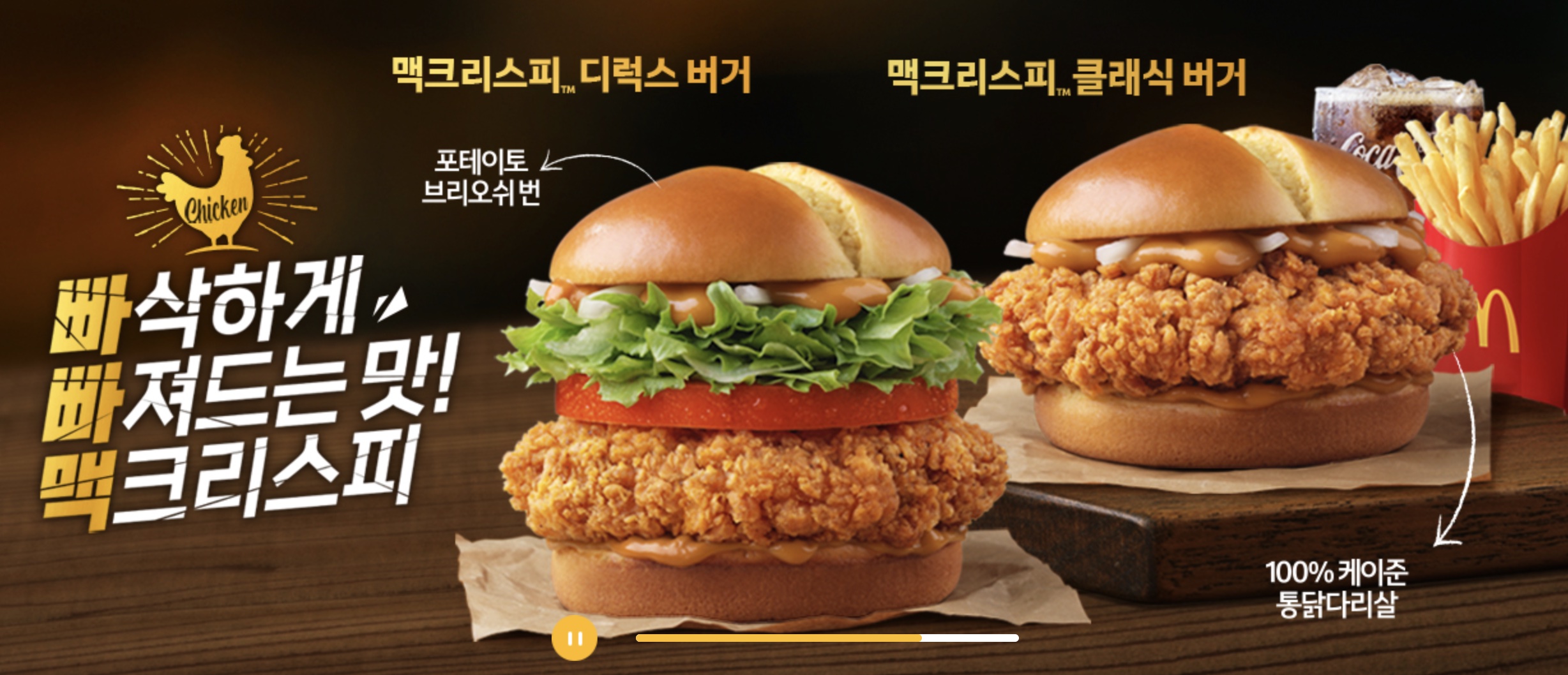 맥크리스피 스리라차 마요는 겉은 바삭하지만 속은 촉촉한 통닭다리살 패티와 스페셜 스모키 소스가 들어있습니다.