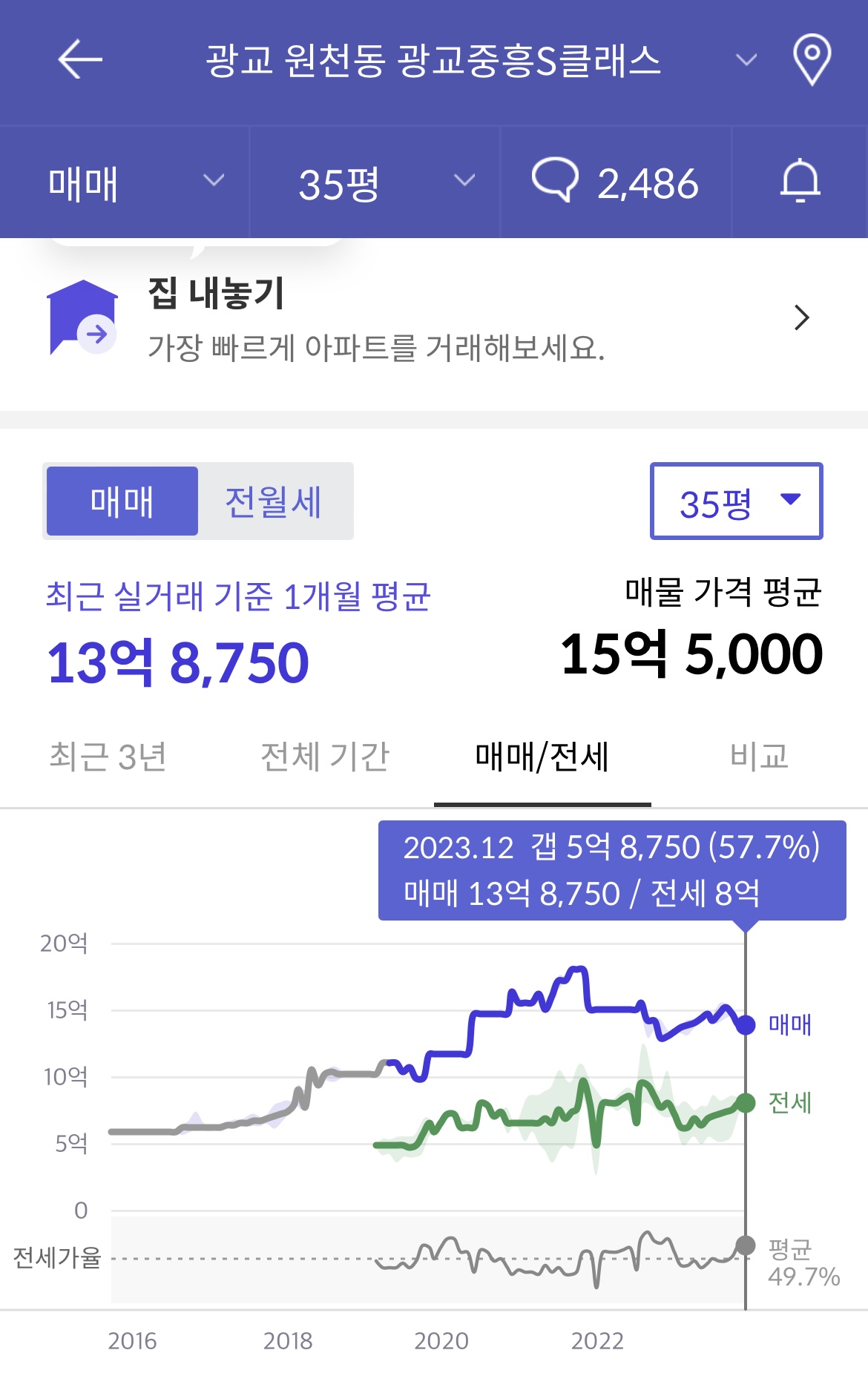 18억까지 올라갔다가 13억정도 까지 내려갔다가 살짝 상승한 13억 8천만원에 매매가격이 올라와있습니다.