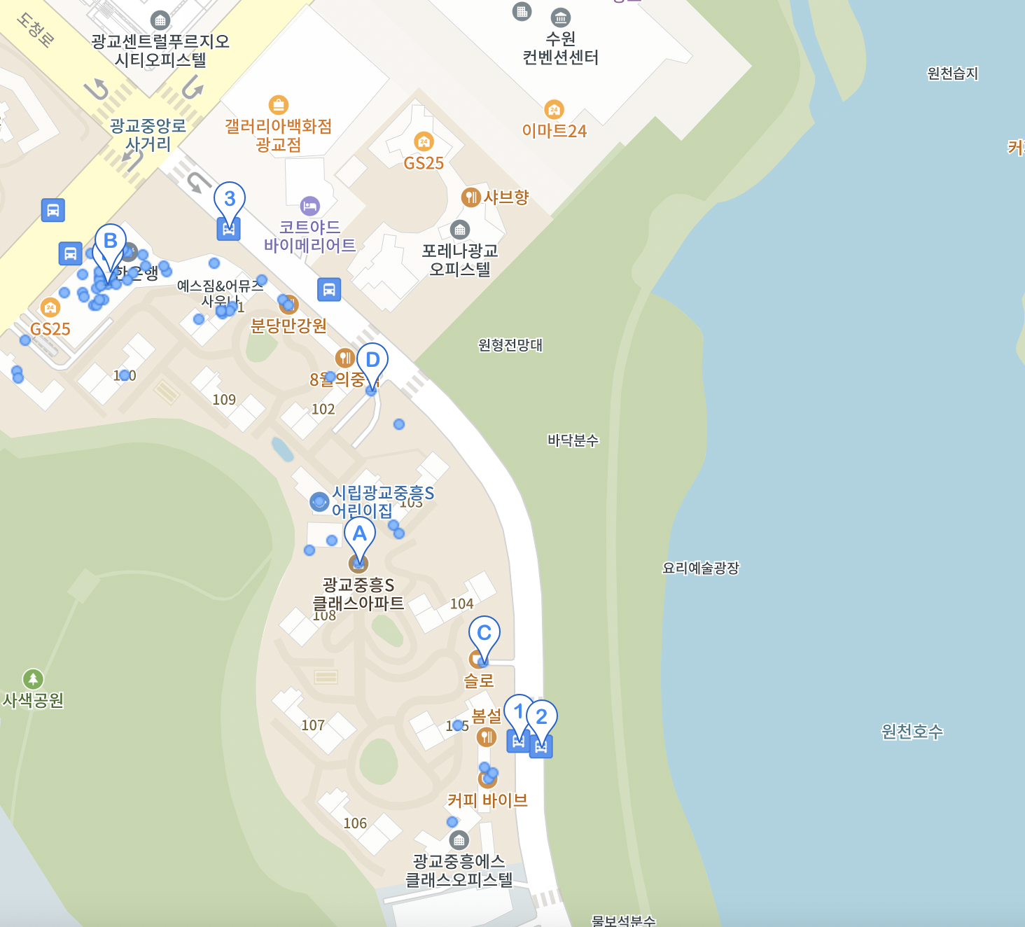 104동과 105동 사이에 카페가 있는데 뷰도 호수 뷰라 상권이 더 좋아 보였습니다.