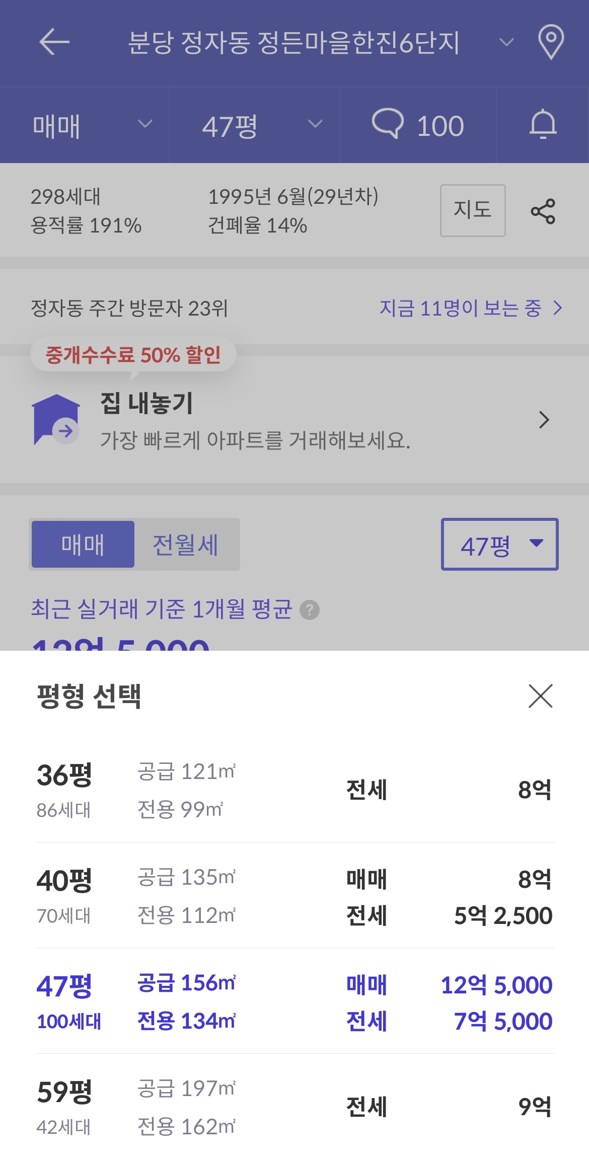 47평 기준으로 보았을때 매매가격은 12억정도이며