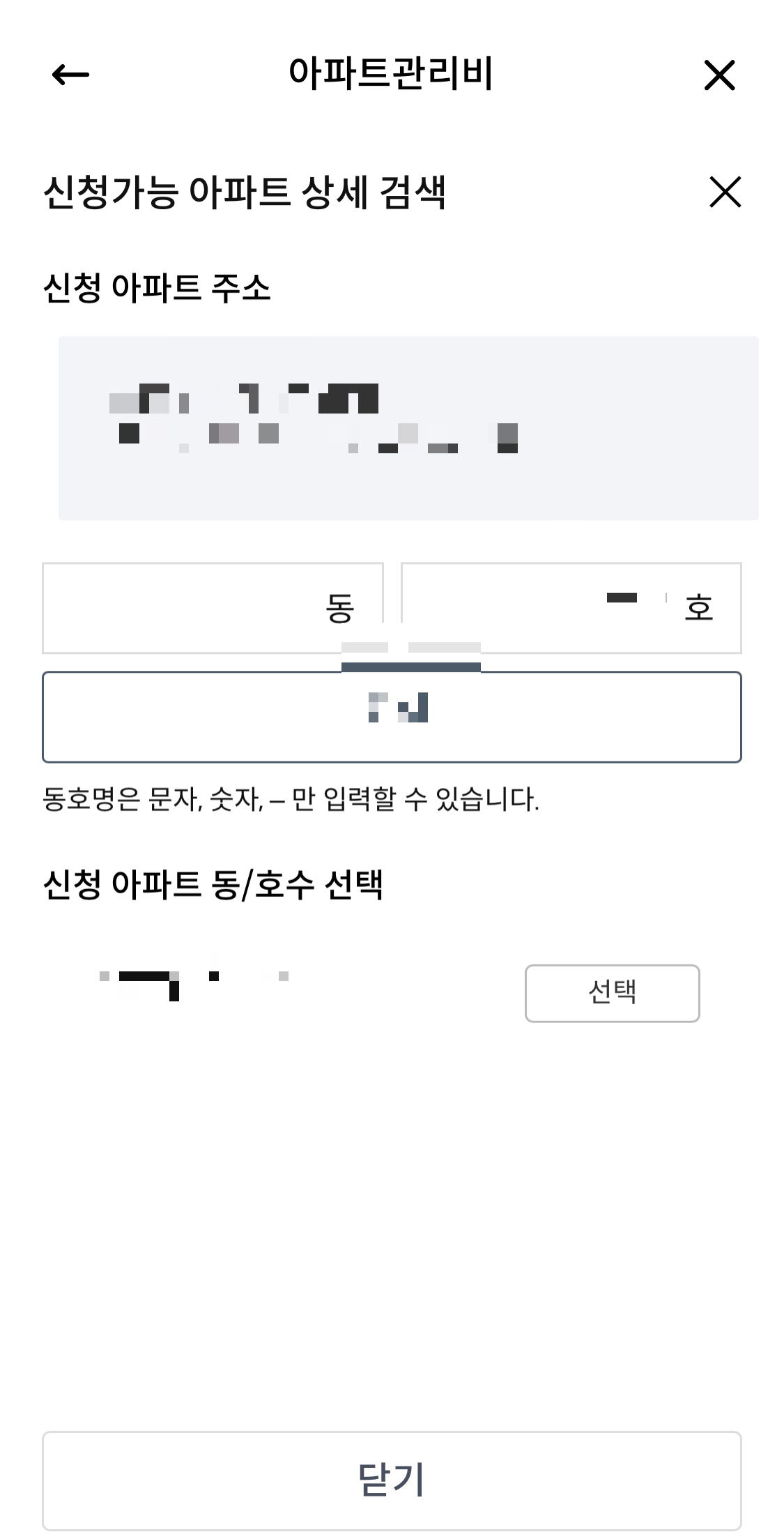 7. 아파트 동호수 포함 주소를 입력해주세요. '선택'까지 누르신 후, 하단의 '닫기' 버튼 터치해주세요.