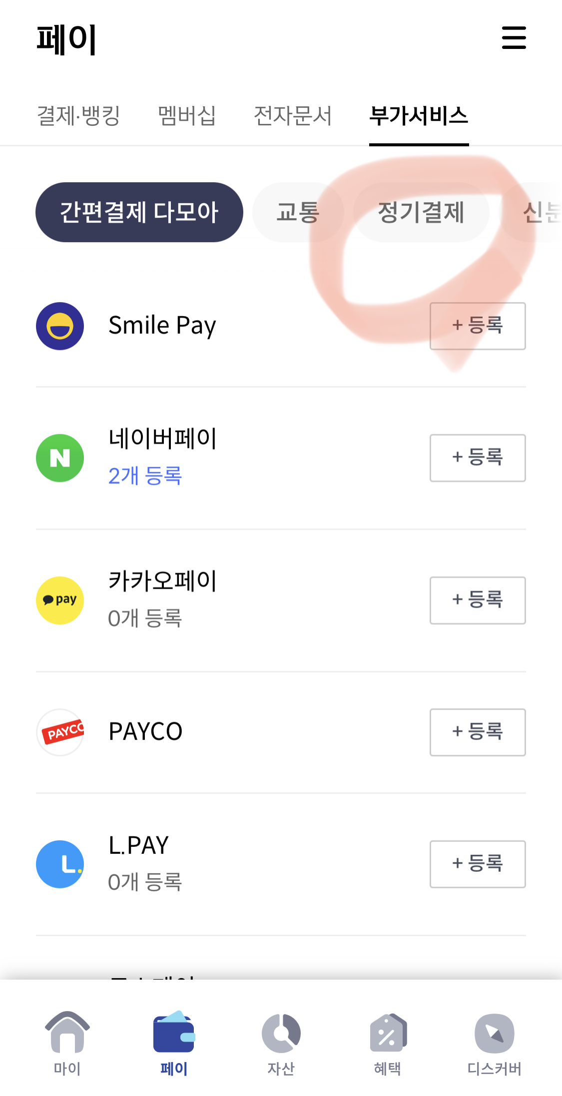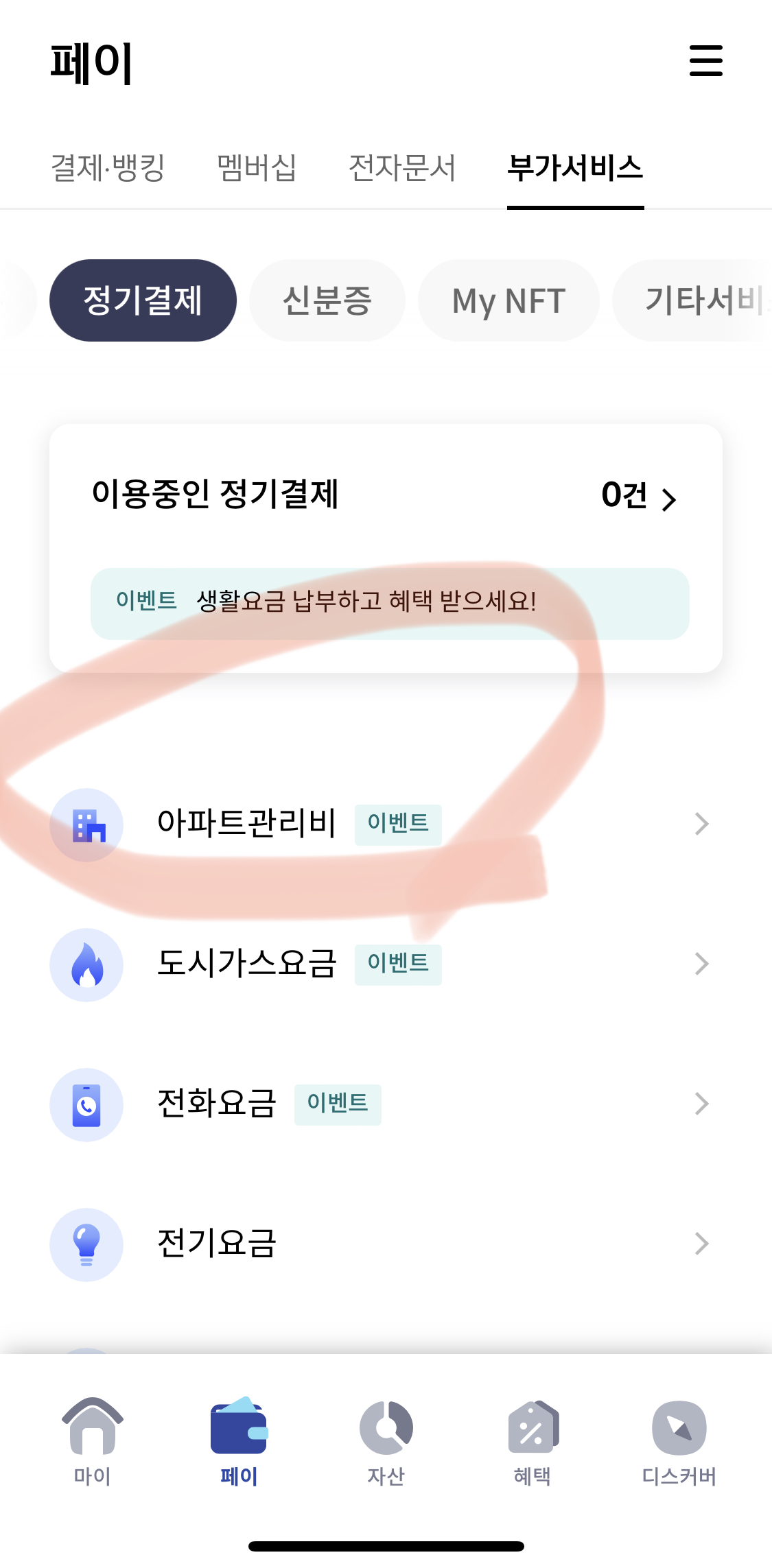 3. 부가서비스 목록 중 상단의 '정기결제' 터치해주세요.