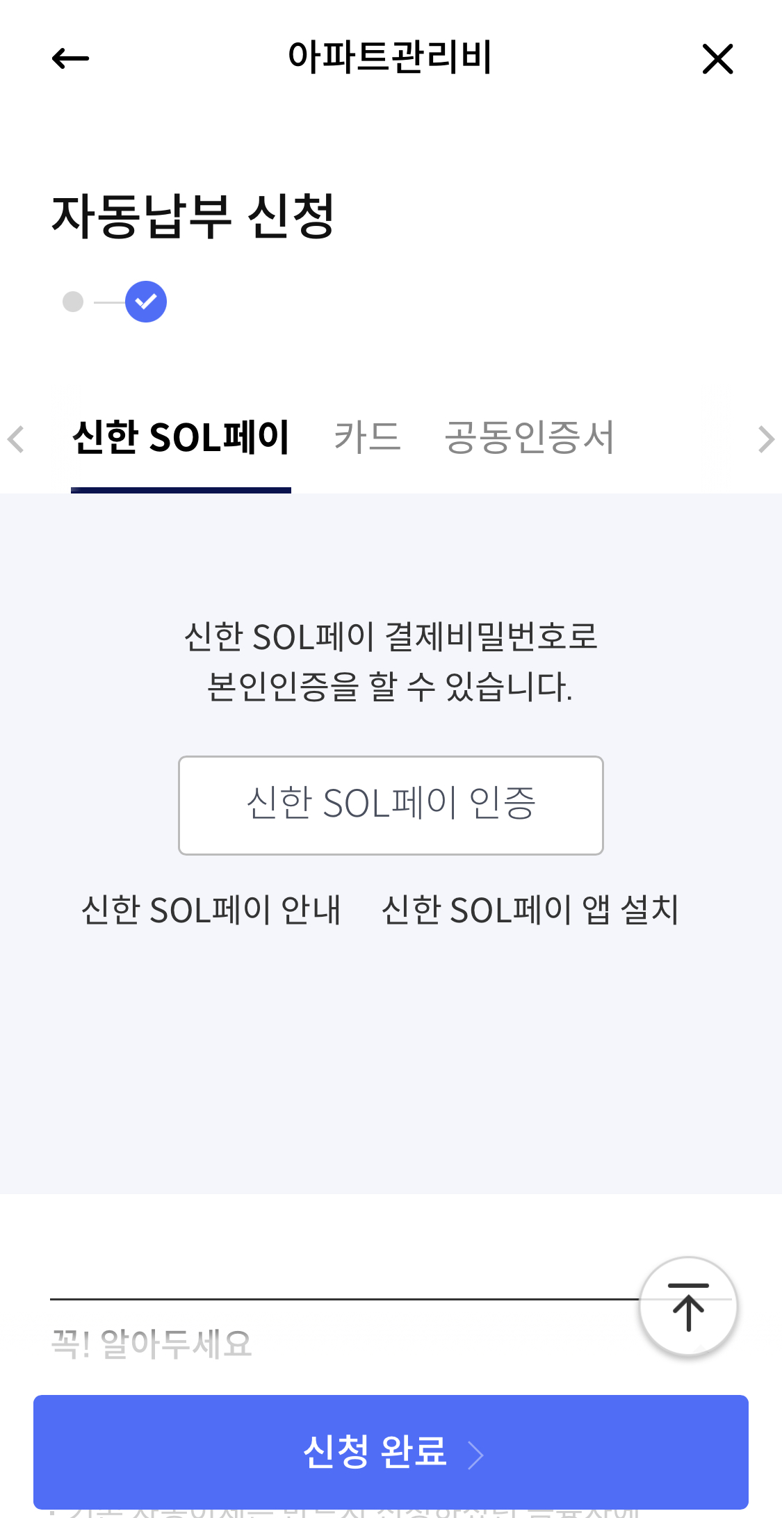 8. 신한 sol페이 인증, 혹은 카드나 공인인증서 인증까지 해주신 후, '신청 완료' 버튼 터치해주세요.