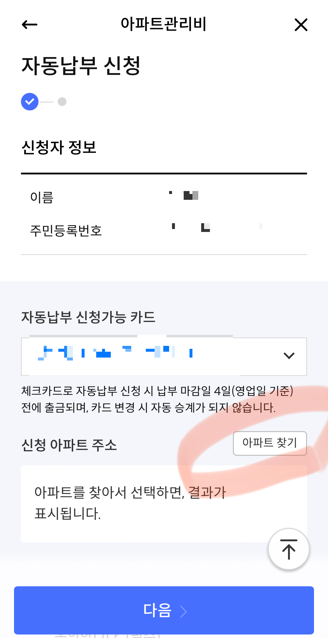 6. 자동납부 신청가능 카드를 하나 선택하시고 (신한카드가 여러개라면), 동그라미친 '아파트 찾기'를 터치하세요.