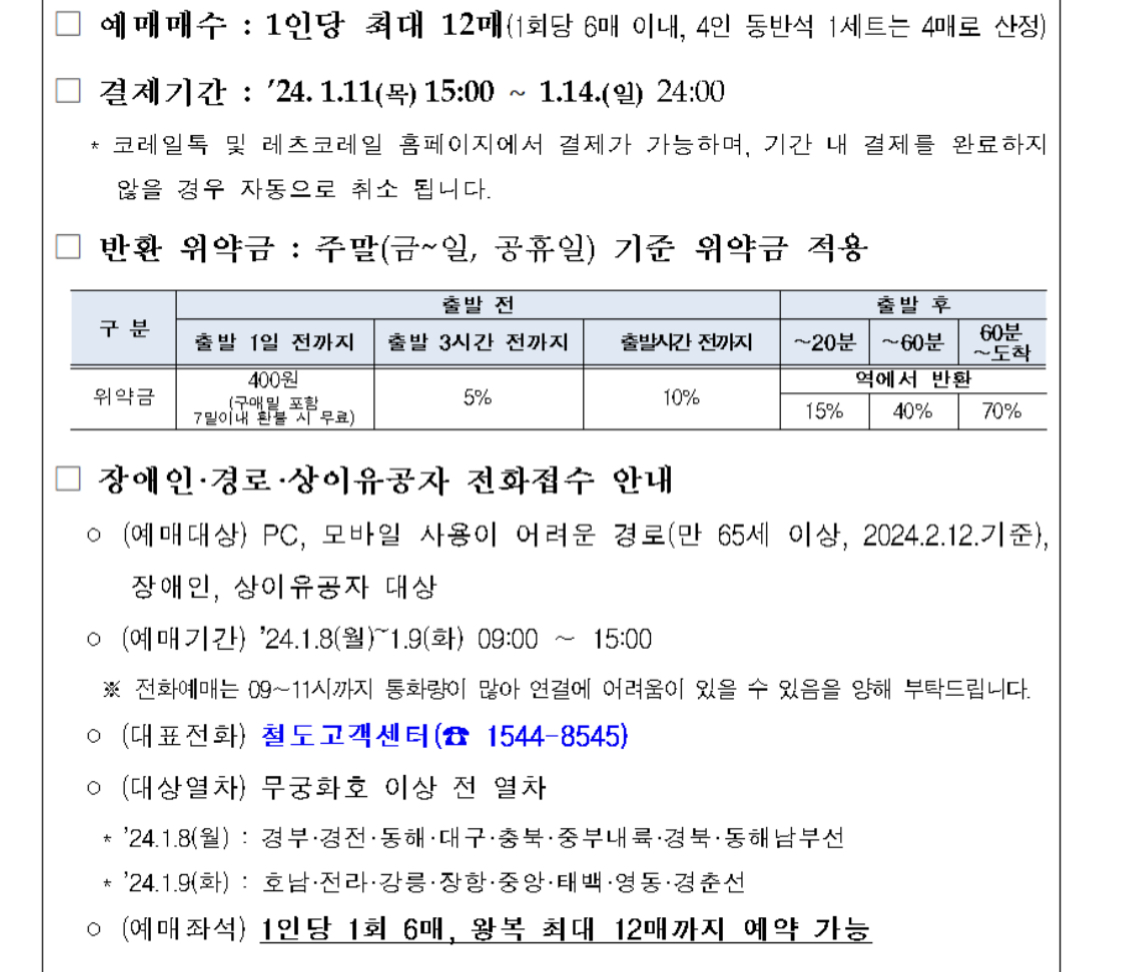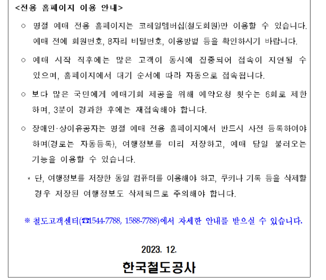 철도 고객센터를 통해서 2024년 설날 기차표 관련 문의를 하실 수 있어요!