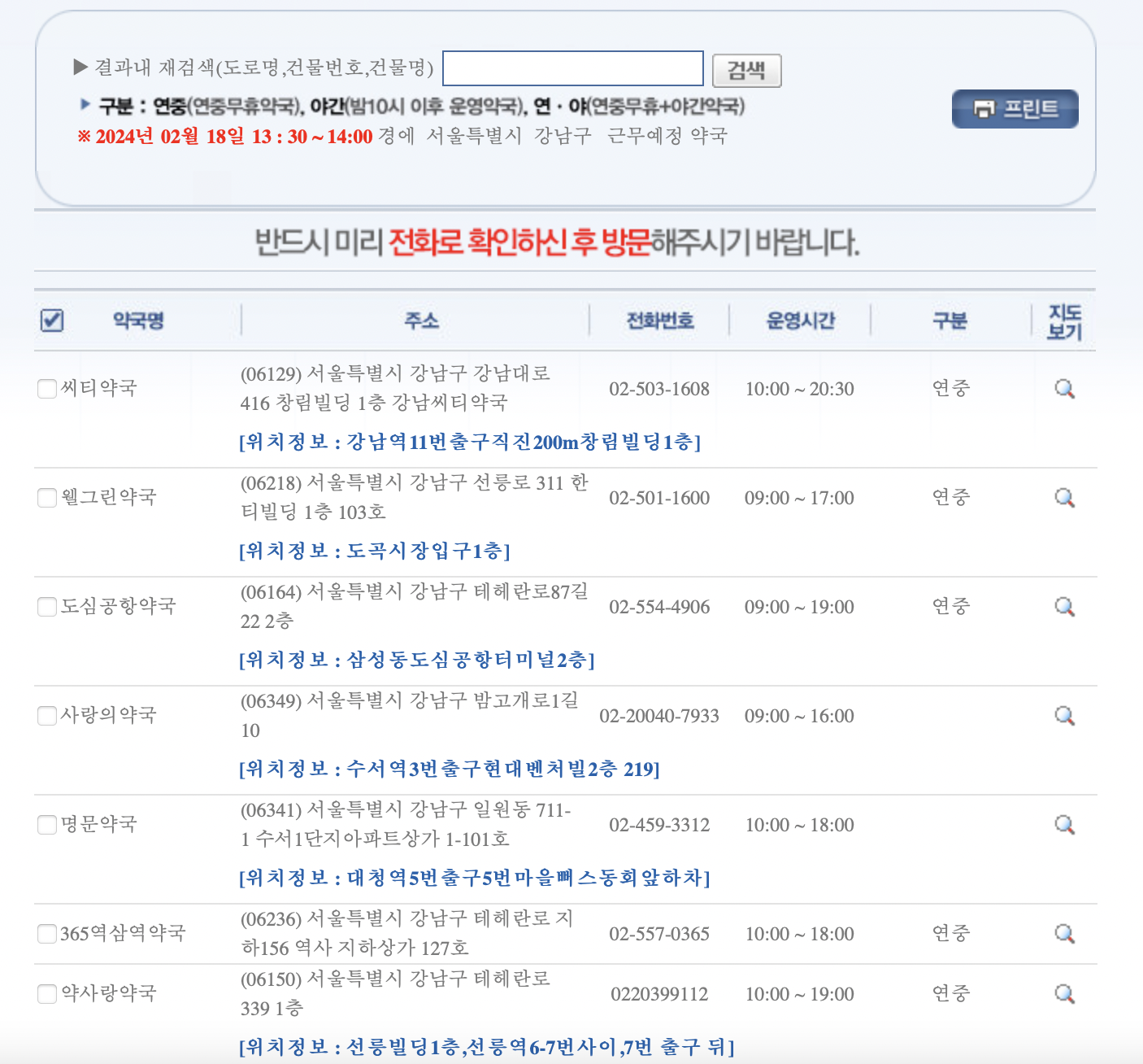약국명과, 자세한 주소, 전화번호, 운영 시간, 지도까지 자세히 뜹니다.