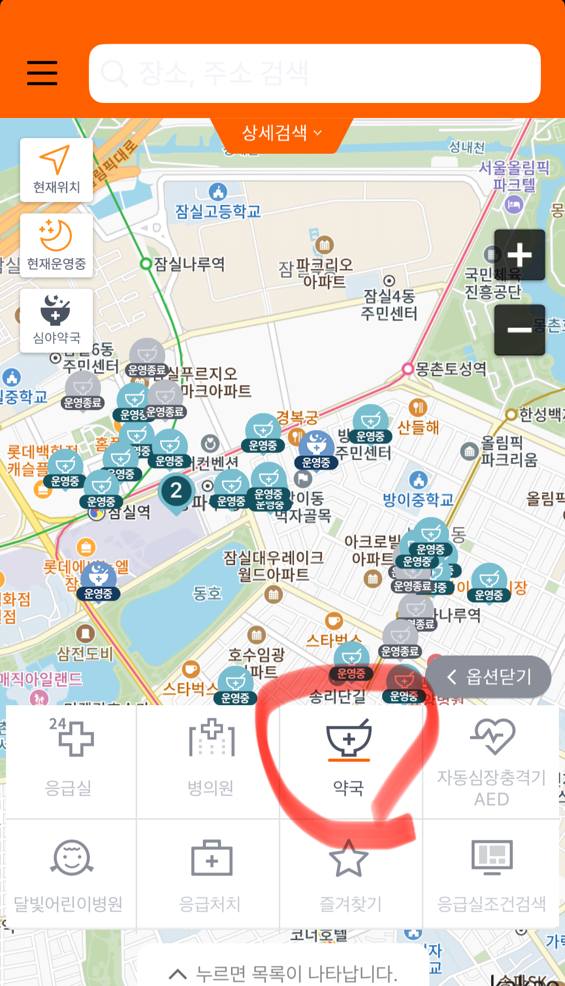 지금 검색중이신 위치 주위의 운영중 약국이 지도에 표시됩니다.