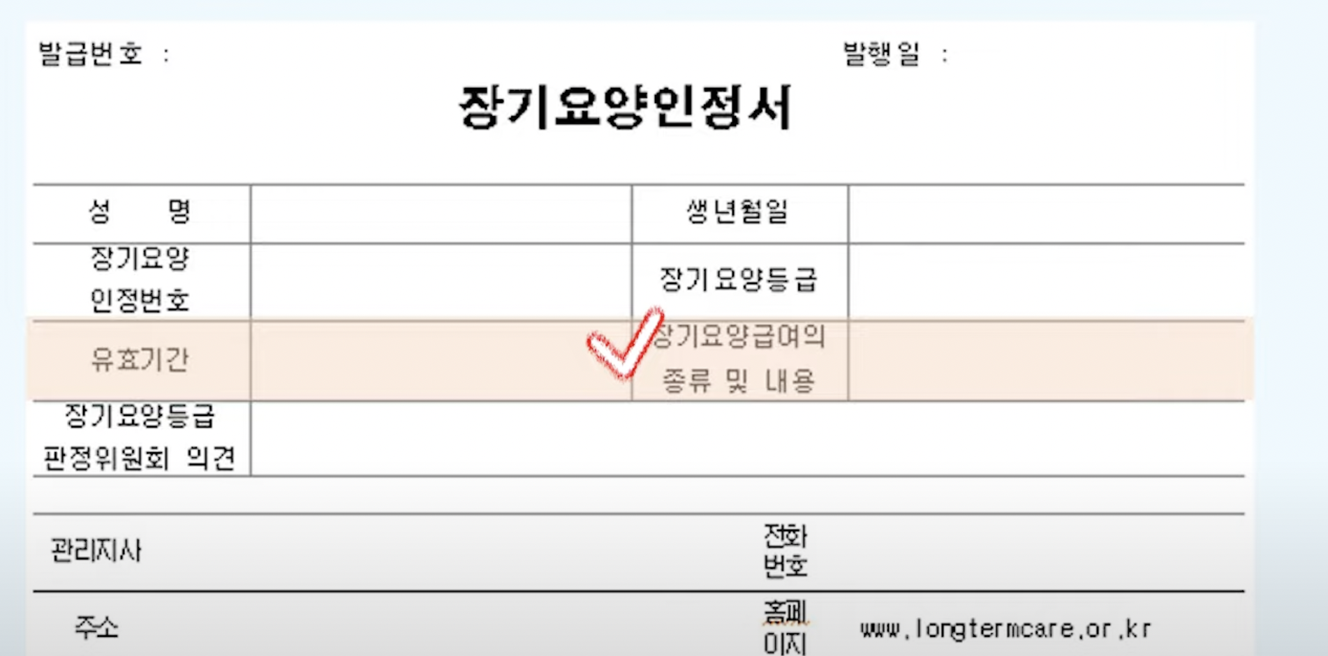 장기요양등급이 있다는 것을 알려주는 서식입니다.