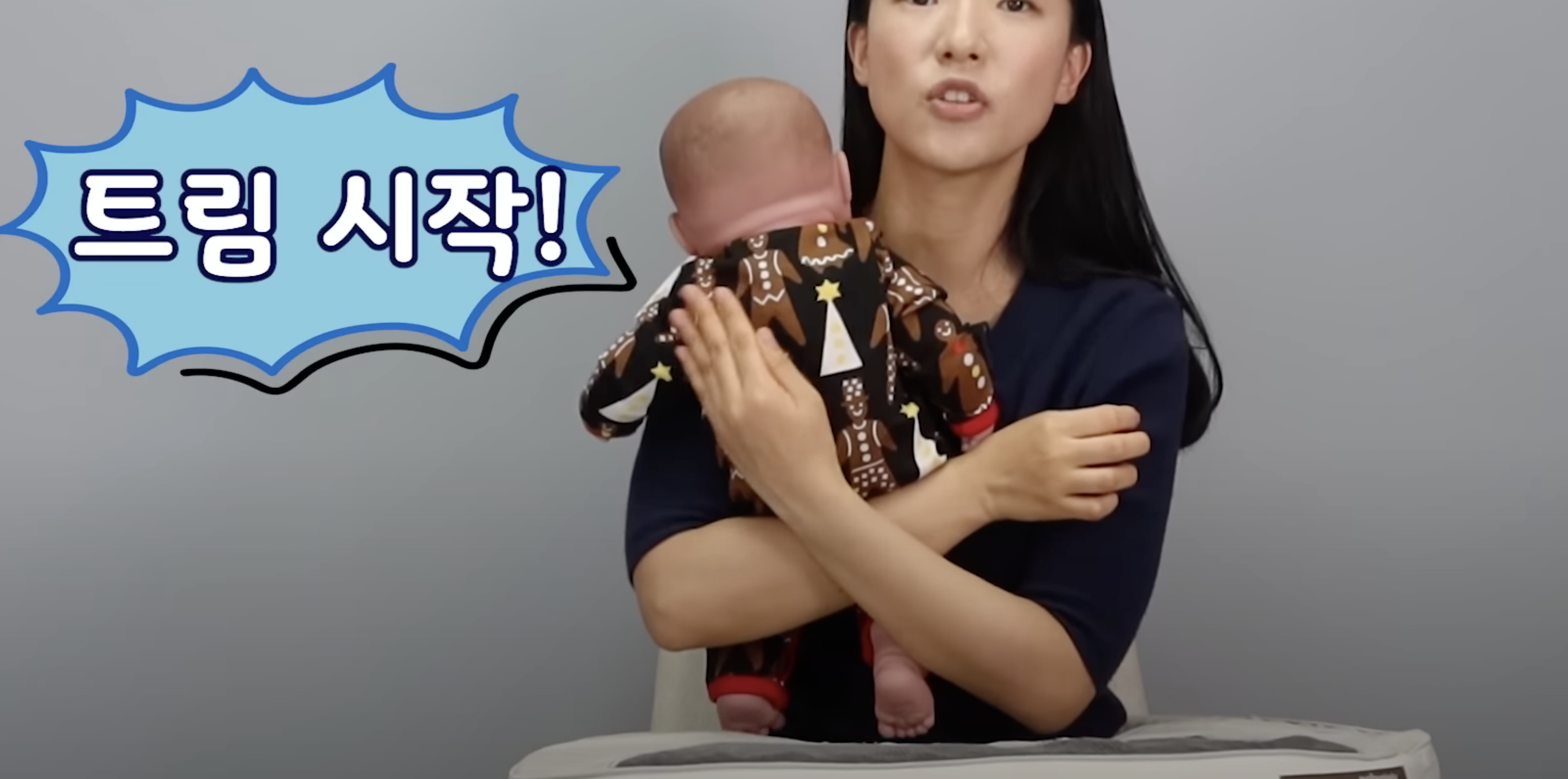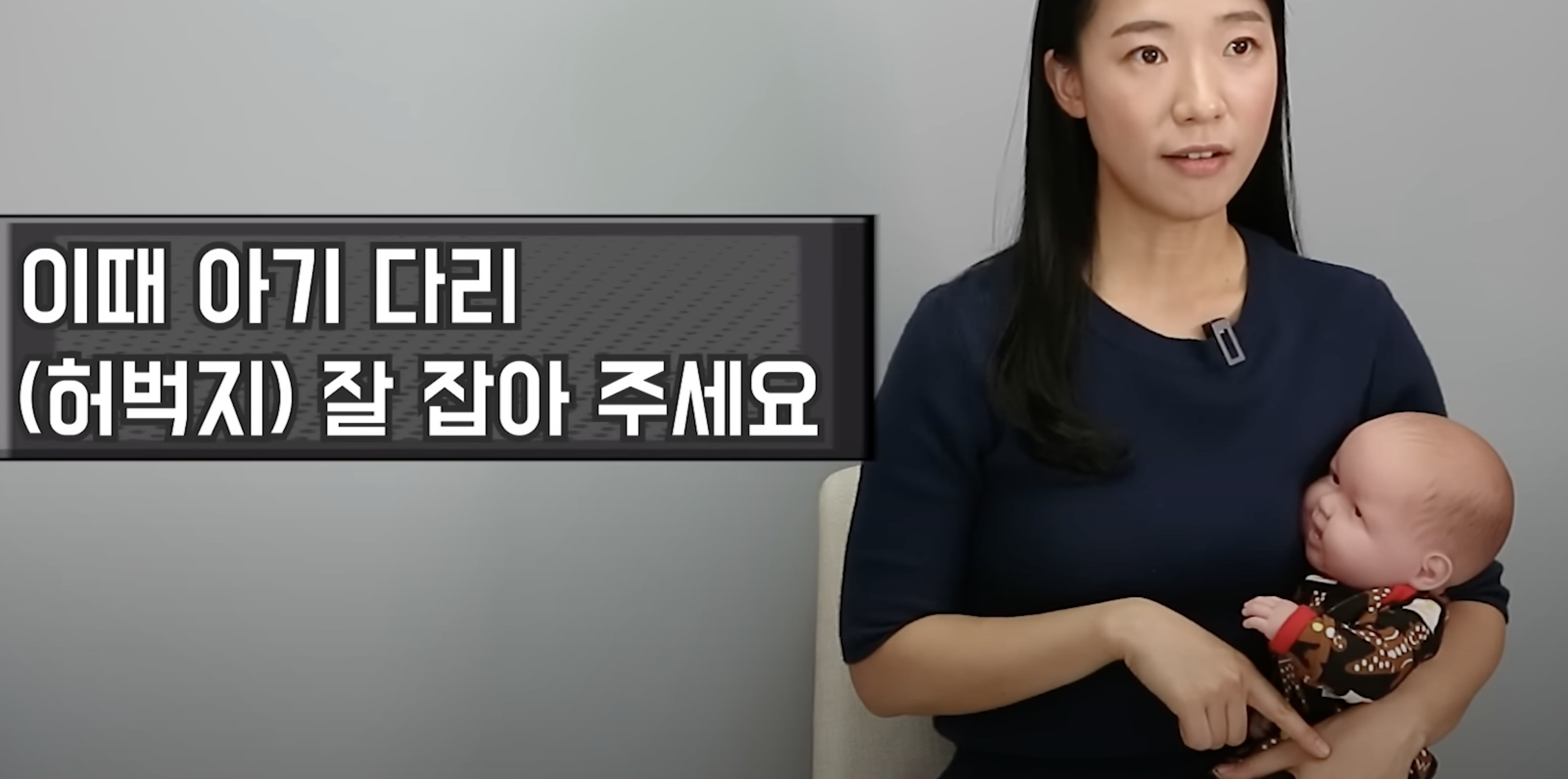허벅지 위에 앉히고, 아기에 어깨동무 하듯이 팔로 감싸 안은 상태로 5분을 유지해주세요.