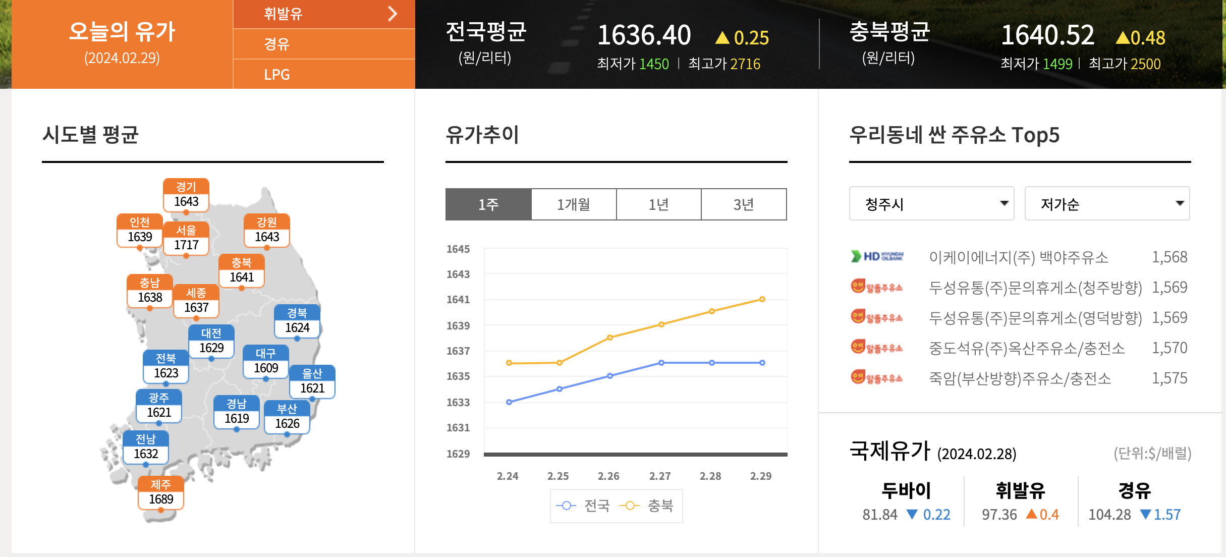 왼쪽 지도에서 지역을 클릭하면, 그 지역별 유가 평균, 가장 싼 주유소 top5, 유가 추이가 바뀝니다.