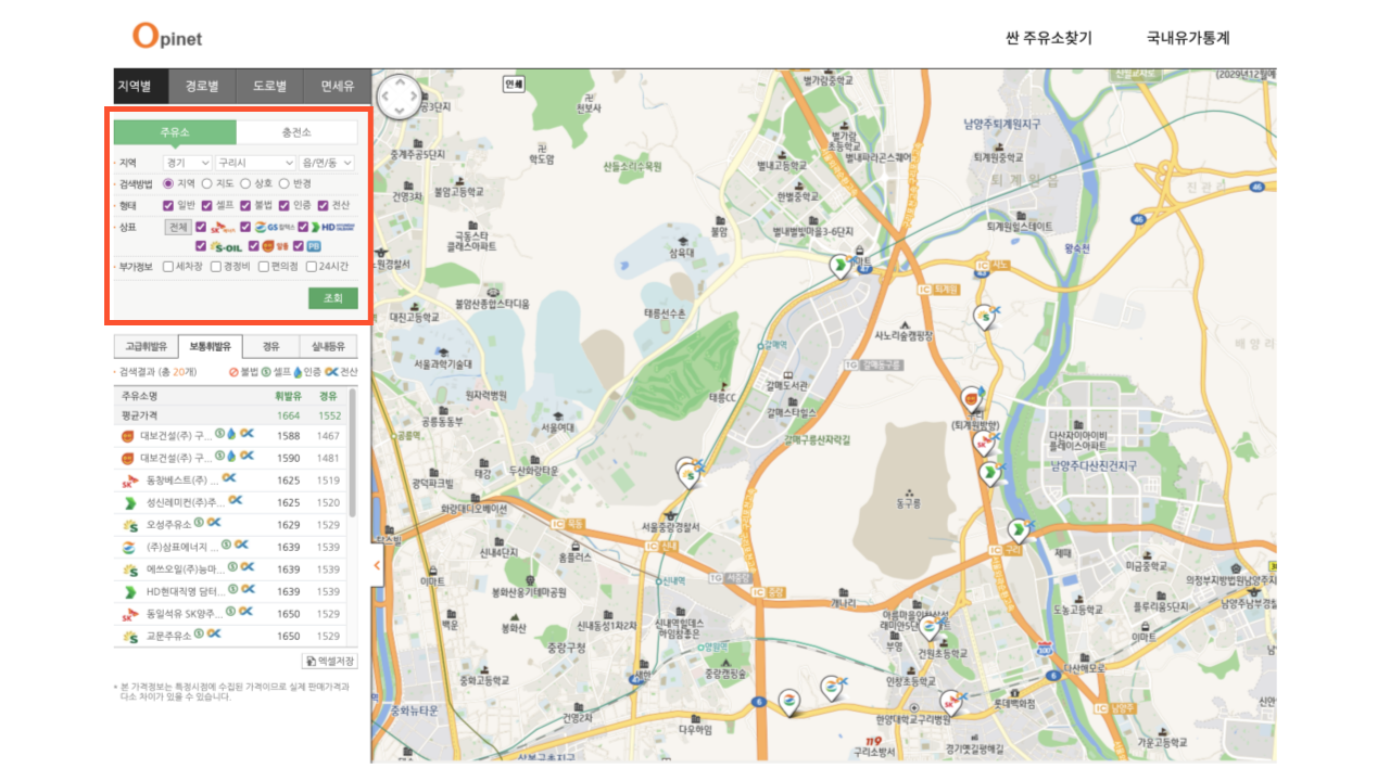 저처럼 경기 구리시로 지역 검색했을 때는 총 20개의 보통 휘발유 주유소가 뜨는 것입니다.