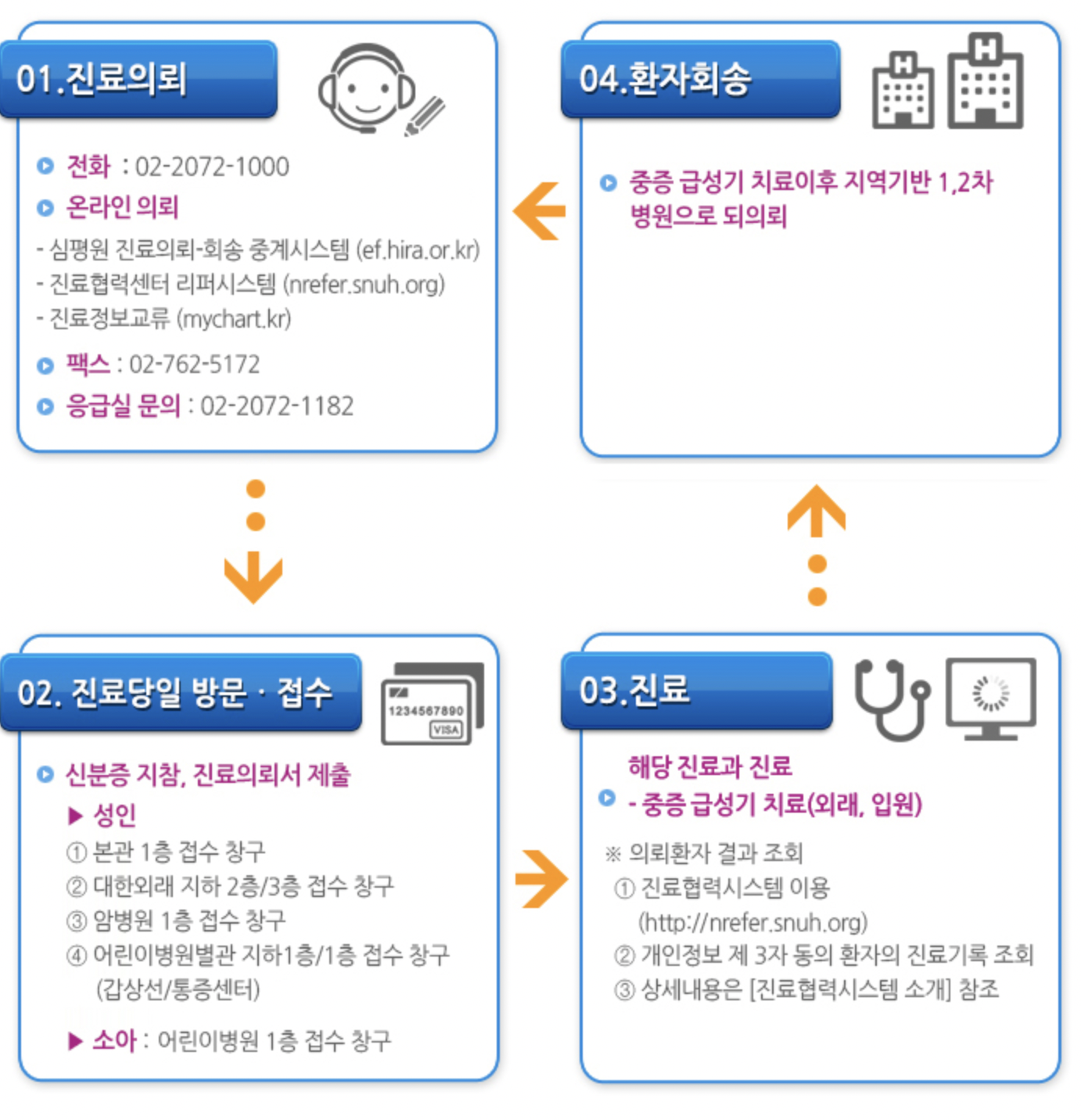 서울대병원에서 진료의뢰시 절차가 어떻게 되는지도 소개하고 있습니다.