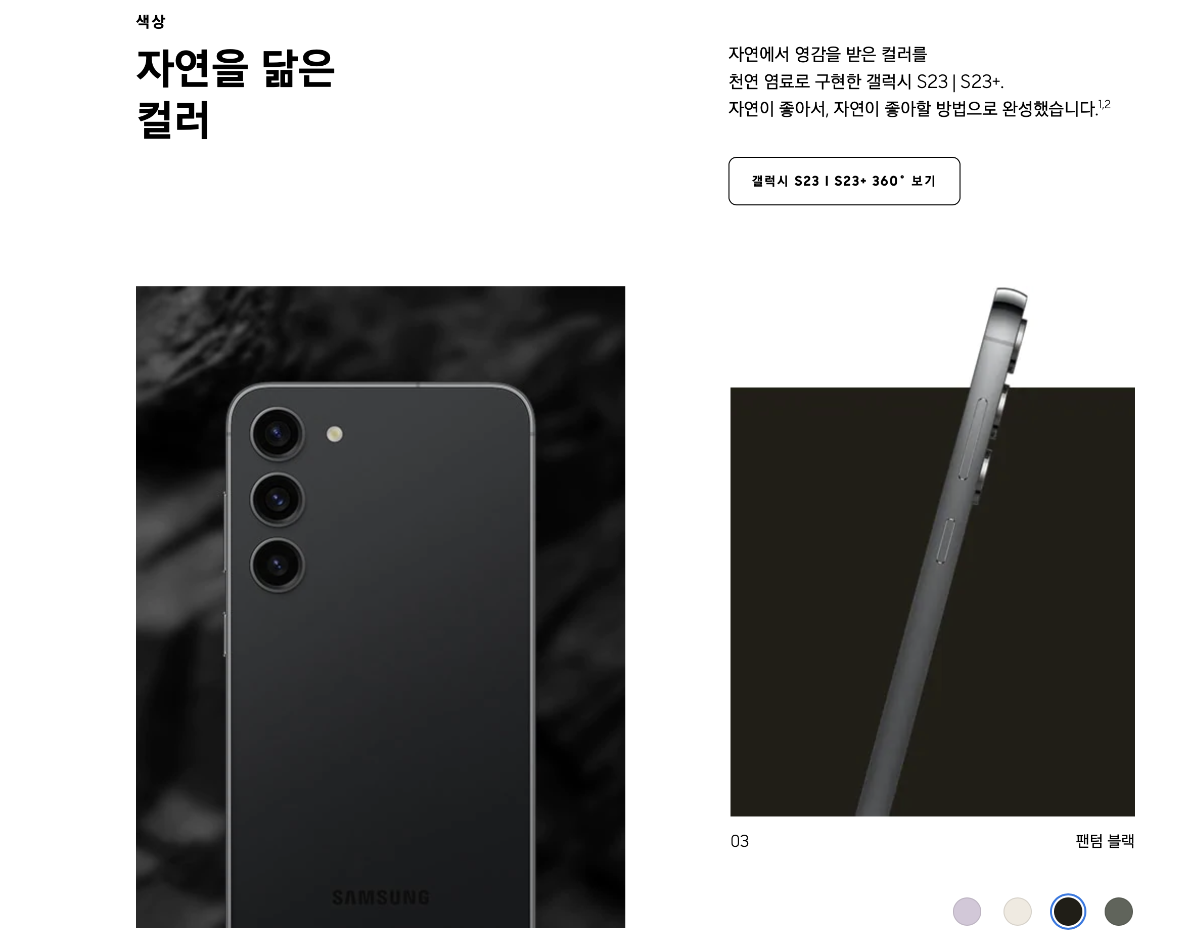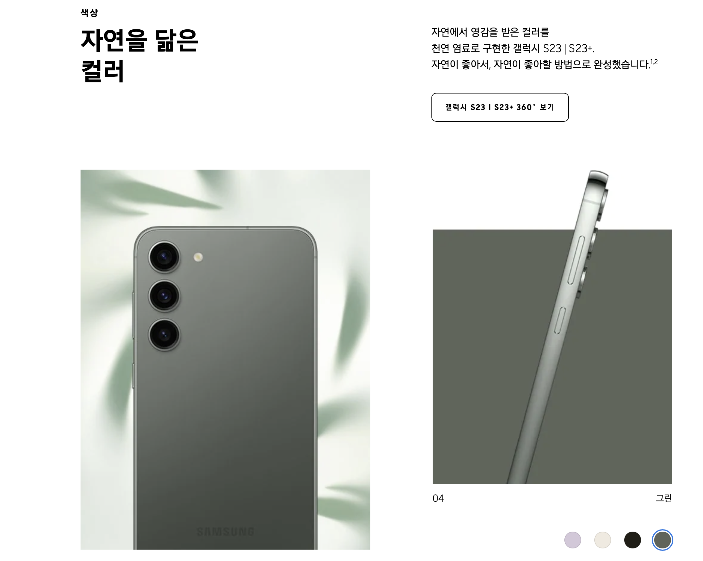자연에서 영감을 받은 컬러를 천연 염료를 이용해 만든 갤럭시 s23, s23+입니다.